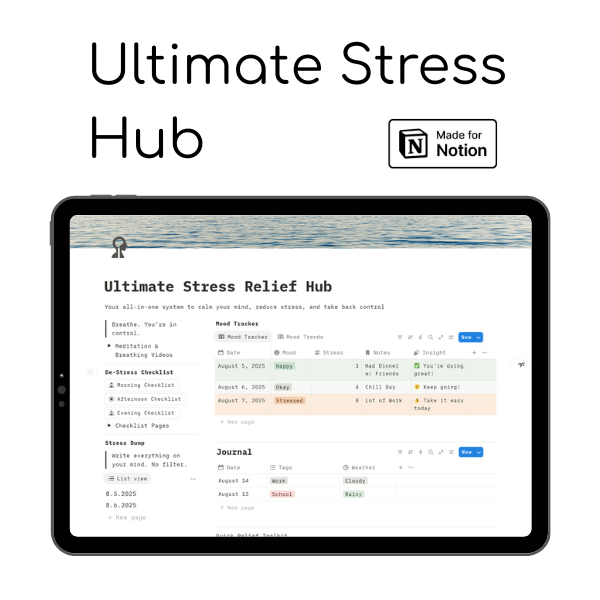 If you are busy all the time, working, it might be taking a toll on you and your brain. But this template is designed to fix that. It includes a meditation video, mood/stress tracker, daily de-stress checklist, and more.